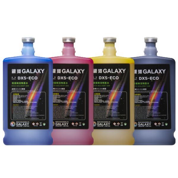 La nueva Tinta GALAXY DX5 ECO (eco solvente), diseñada especialmente para cabezales con tecnología piezo eléctrica EPSON, DX4 y DX5. Gracias a su nuevo avance, la tinta GALAXY DX5 ECO se adhiere perfectamente en sustratos para impresión digital de medio y gran formato ofreciendo un secado muy rápido con gran estabilidad en producción.